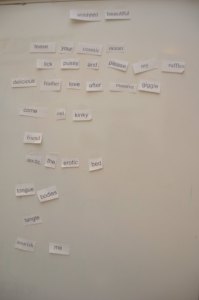 An image from a World AIDS Day activity. A white backdrop with tiny slips of paper each containing typed words that are not clearly distinguishable. The slips are arranged loosely in rows.