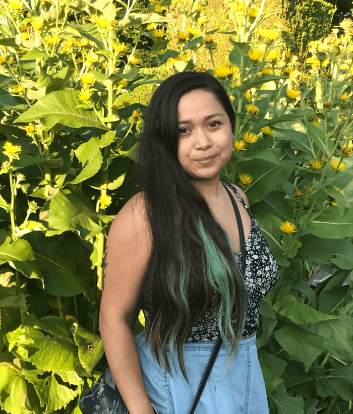 A photograph of Lydia smiling in front of flowers and greenery growing over their head. Lydia has long black hair with green lowlights.