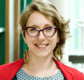 A photograph of Sarah smiling with her teeth. She has blonde, short, wavy hair and wears purple glasses and big, gold hoop earrings. Her red blazer and polka-dotted blouse are partially shown.