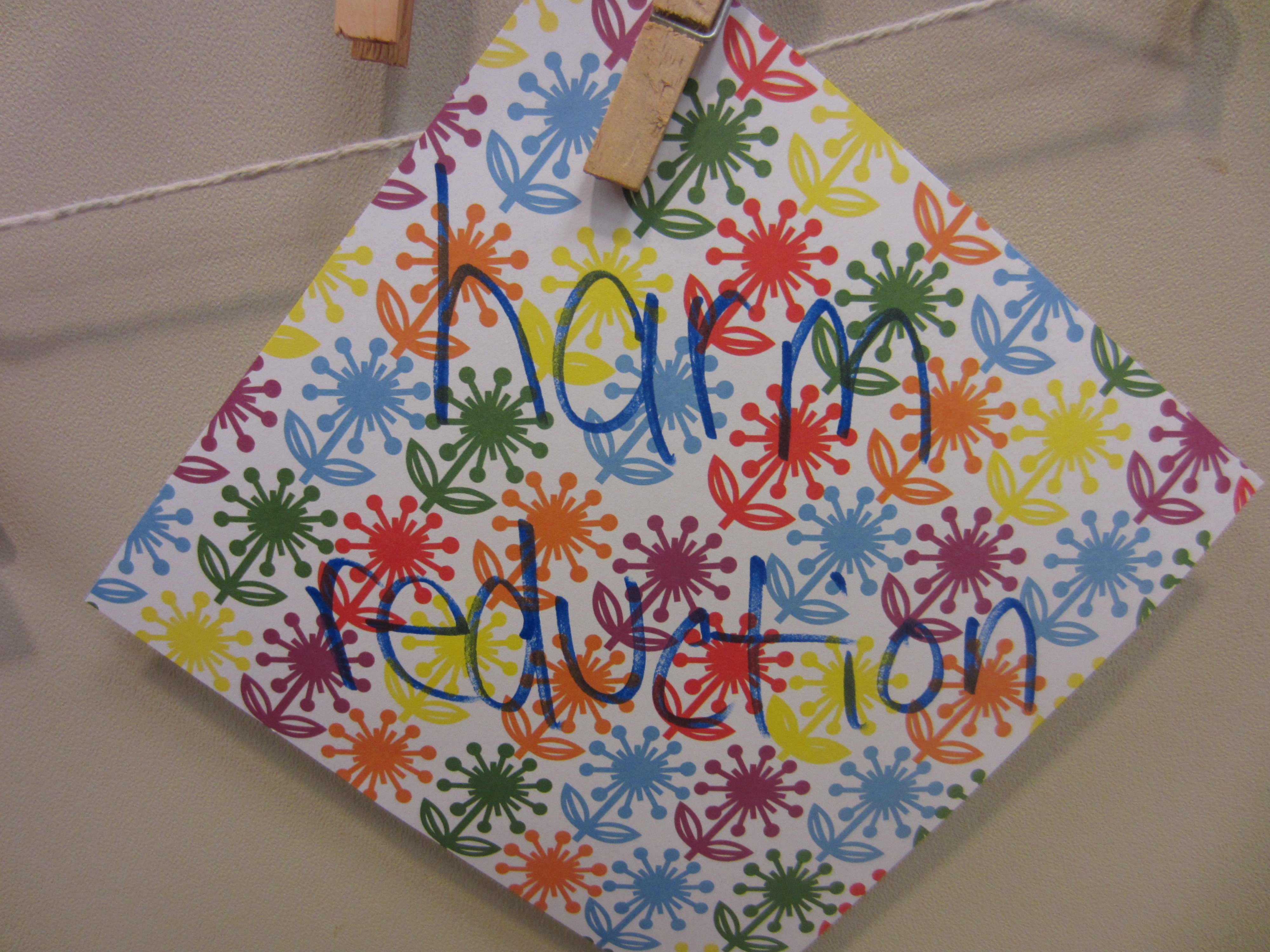 A multicoloured, flower-designed, square-shaped piece of paper with, harm reduction, written on it in blue ink.