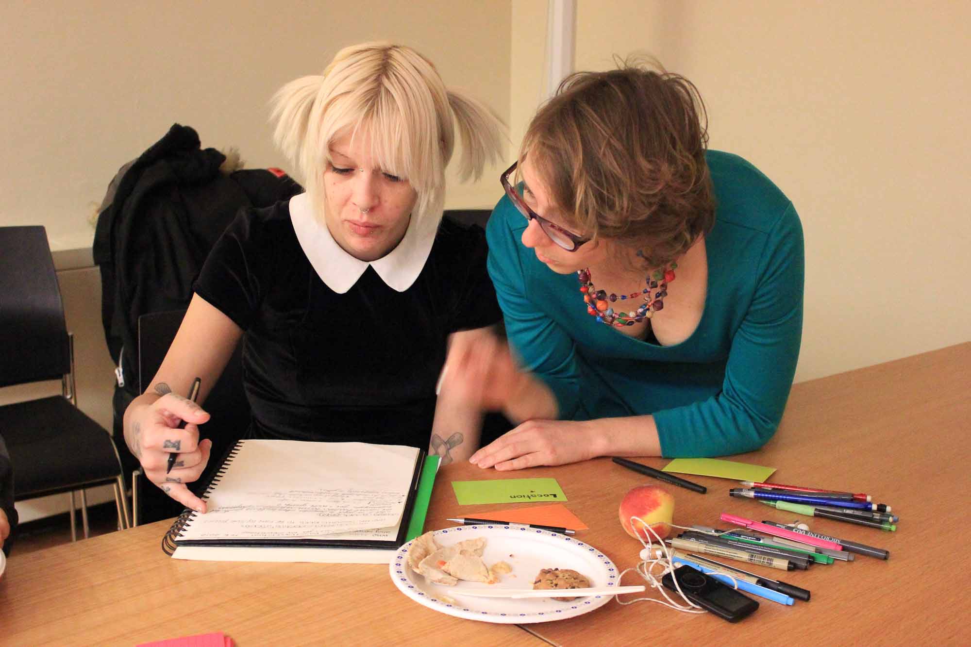 Sarah Switzer assists a person sitting at a table with an open notebook, pens, and an empty plate in front of them.