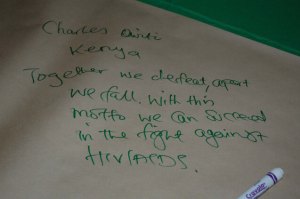 A note written in green marker on a piece of off-white paper. The note says a person’s name and the following: Together we defeat, apart we fall. With this motto we can succeed in the fight against HIV/AIDS.