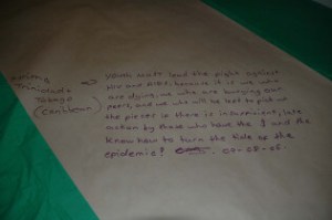 A note written in purple marker on a piece of off-white paper with green borders. The note says the following: Youth must lead the fight against HIV and AIDS, because it is we who are dying, we who are burying our peers, and we who will be left to pick up the pieces if there is insufficient, late action by those who have the $ and the know how to turn the tide of the epidemic! 09-08-06.