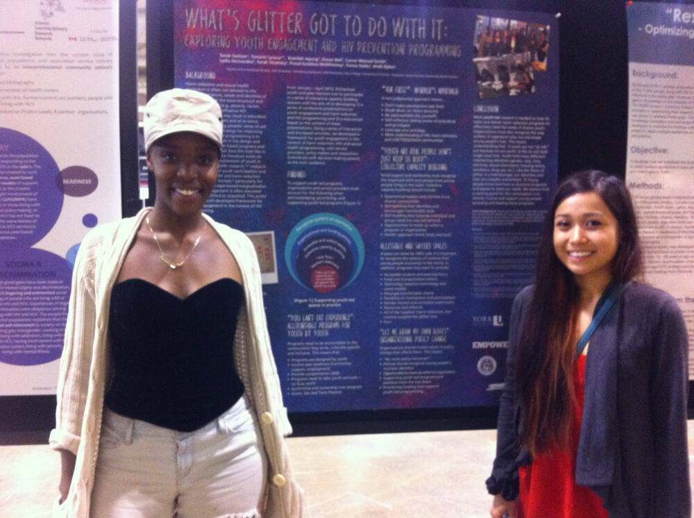 Tumaini Lyaruu and Lydia Hernandez stand on either side of a poster presentation and smile. The poster is mostly purple, except for text and graphics, and it is titled, What’s Glitter Got to Do with It.