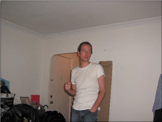 A candid photo of a person with a buzzcut, wearing a white t-shirt and jeans. The person stands in the center of a room with off-white walls and appears to be talking to someone to the right of them.
