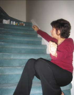 A person, wearing a red long-sleeve shirt and black pants, is seated at the bottom of a velvet blue staircase. They are pointing to pill bottles at the top of the stairs.