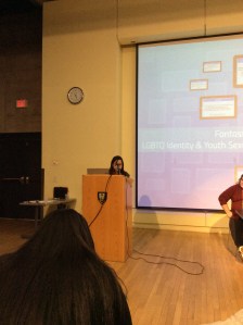 A person stands at a podium, speaking into a microphone. The projector behind them displays a presentation.