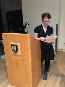 A person with short brown hair, wearing a Black dress, holds a piece of paper, as they stand next to a podium with a microphone. This person appears ready to give a speech.