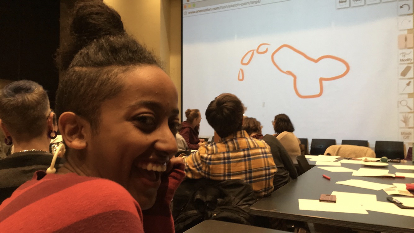 A person smiles, as they sit at a desk in a lecture hall. Behind them are other students facing a projector that shows a sketch of a phallic object releasing semen.