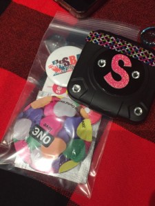 A clear plastic bag containing a condom, a pin, and business cards. A black square object with a sparkly pink S sticker is on top of the bag.
