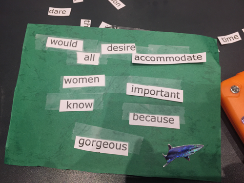 A green poster with a blue shark sticker and white slips of paper taped onto it. On each slip of paper are one of the following words: would, desire, accommodate, all, women, importance, know, because, gorgeous.