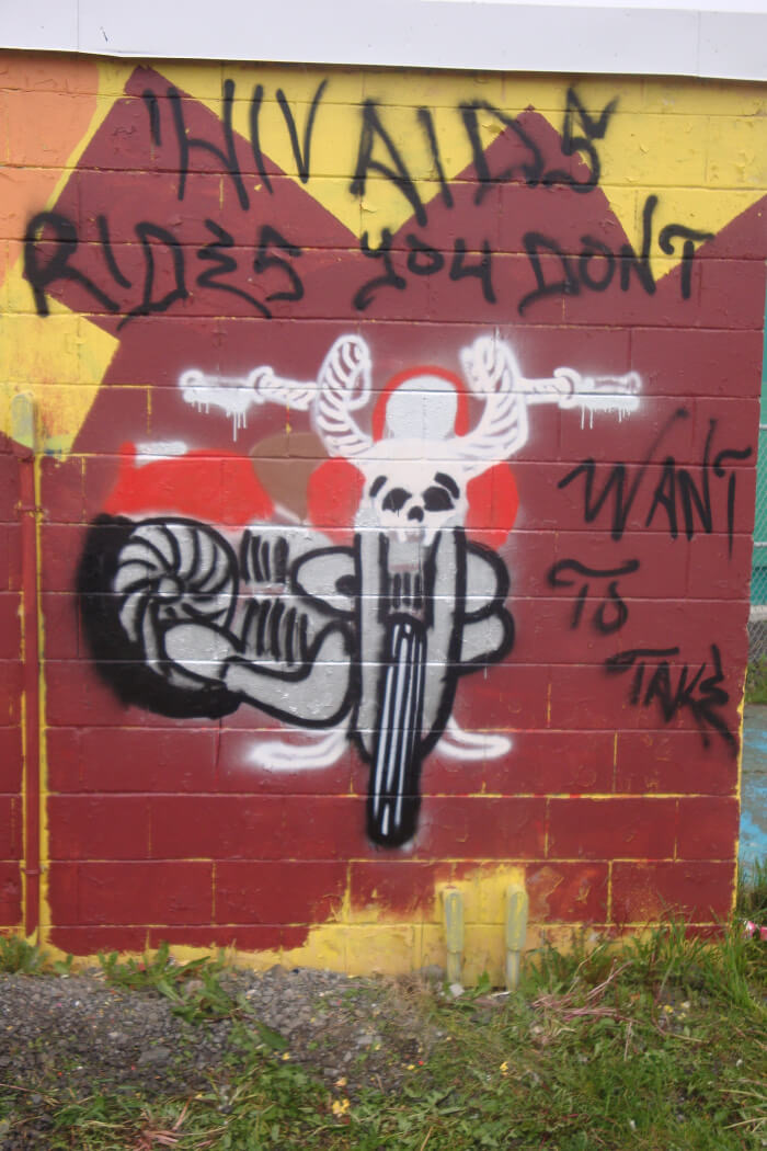 Multi-coloured graffiti of an abstract illustration and the words, HIV AIDS Rides You Don’t Want To Take.