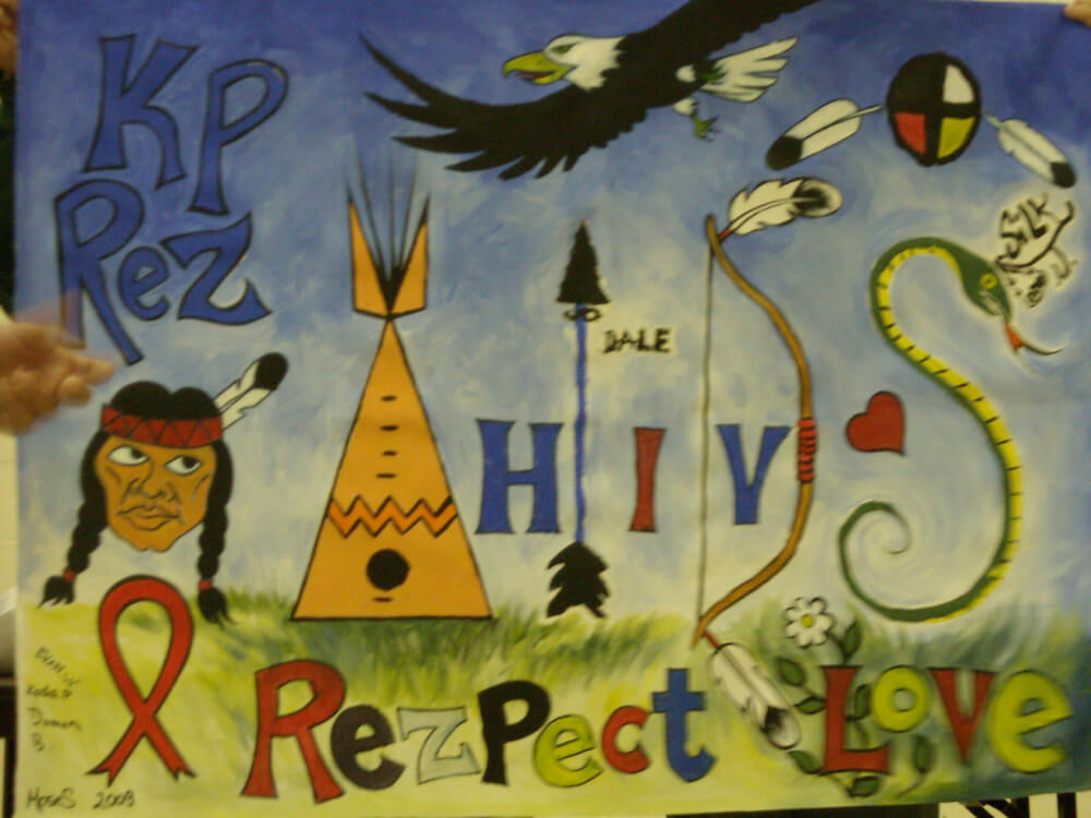 A watercolour scene showing the red AIDS ribbon, a teepee, an eagle, a medicine wheel, a snake, a bow and arrow, the head of a person in a traditional Indigenous headdress, and the words, kp rezpect love.