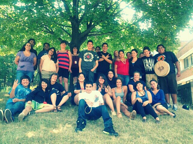 A group of people gather for a photograph in front of a full green tree. Half of the people are standing and the other half are sitting in the grass. They all are smiling.