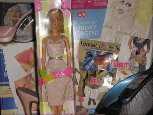 A Barbie doll with blonde hair, wearing a pink and green dress, in her original box. Behind the Barbie is a collage of miscellaneous items including laundry detergent, magazine cut-outs, and shoes.