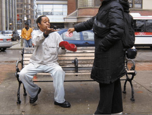 A person dressed in mostly white, sits on a bench on a city street. The person opens their hands to a person standing up, dressed in all black, who hands out two slips of red paper.