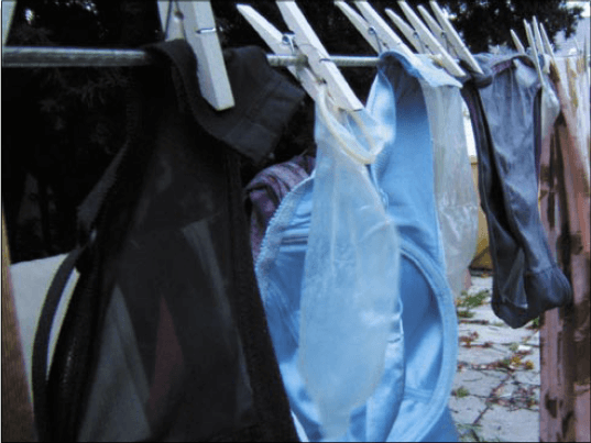 Bras and underwear of different colors, black, white, shades of blue, and beige, hang on a clothesline.