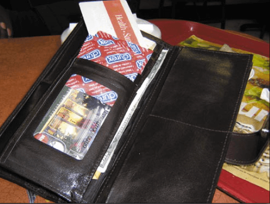 An open wallet, holding condoms, cash, a debit card, and miscellaneous paperwork. The wallet rests on an empty McDonalds tray.