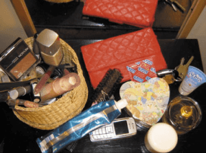 A vanity with a red purse, toothpaste, condoms, a cellphone, a hairbrush, keys, a wicker basket of makeup, and other miscellaneous beauty products on it.
