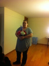 A photograph of Rainbow holding a bouquet of flowers and softly smiling. Rainbow is wearing a long blue t-shirt and black jeans, and she is standing in an empty room.