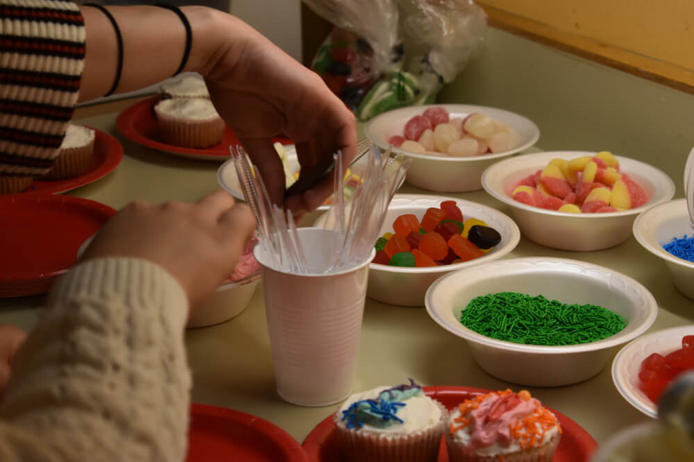 Sexy cupcakes in the making. Styrofoam bowls filled with different candies are lined up on a surface. Two hands reach into one of the bowls. Two decorated cupcakes are shown.