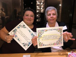 Two people seated side-by-side and smiling. They each hold up their Planned Parenthood Affirmation Cards, which they have coloured.