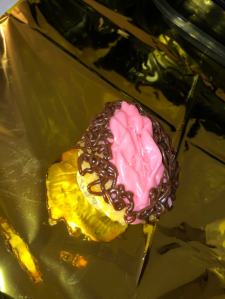 A cupcake decorated to look like a vulva with brown and pink icing. The cupcake rests on a gold tablecloth.