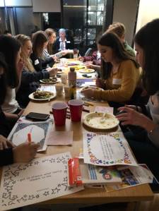 A group of people seated at a rectangular table, eating and colouring. There are cups, plates, coloured pencils, and papers on the table.